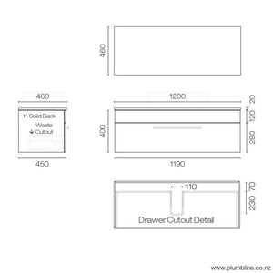 IMPORTANT NOTE: This vanity is not supplied with any tap or waste cut out holes. Standard sized drill bits are provided and it is the responsibility of the installer to drill these holes in to the benchtop.