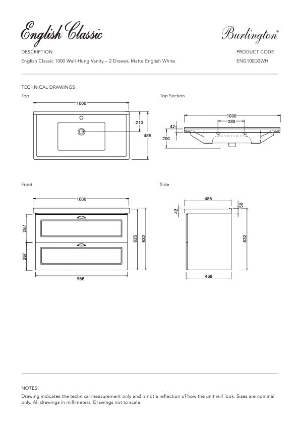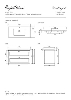Burlington English Classic 1000 Wall Vanity | 1 Basin + 2 Drawers