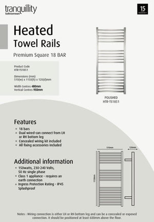 The Tranquillity Premium square heated towel rail range offers exquisite function combined with a sleek design, and without a doubt will become an attractive feature in any bathroom.