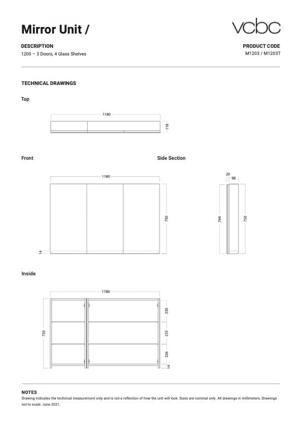 VCBC 1200 Mirror Cabinet | 3 Doors & 4 Shelves