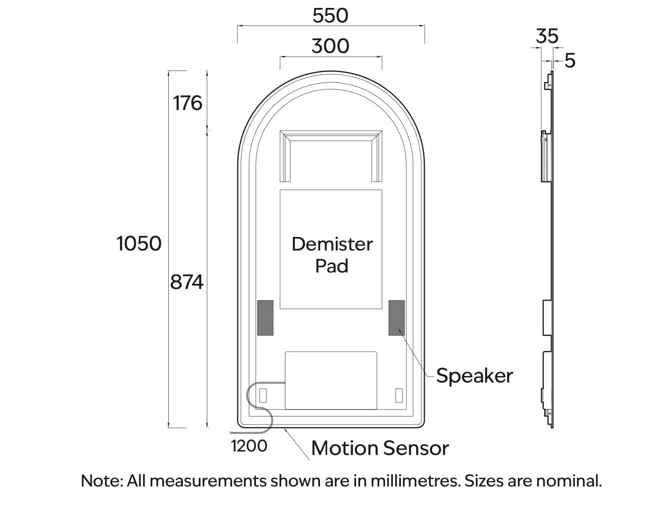 Code Interiors Euro Arch LED Mirror | Bluetooth Speaker | 550W x 1050H
